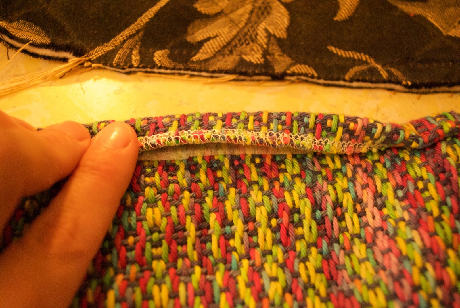 Cutting a length of cloth of the loom is so exciting! But then what? If you’re not leaving a fringe you have to finish the fabric somehow, and if you’re cutting into it you may be afraid of unravelling. This is a great, easy method to use for either finishing to hem or if you need to cut into the fabric.